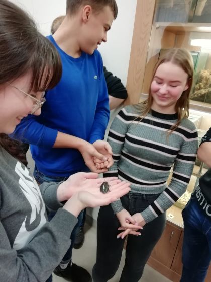 Moksleiviai integruotą pamoką tęsė Biologijos ir augalų biotechnologijos instituto Entomologijos laboratorijoje. Čia mokiniai turėjo puikią progą iš arti susipažinti su žmonių gyvenamosios aplinkos kaimynais – vabzdžiais. Ekologiniu požiūriu ši gyvūnijos grupė labai įvairi, užima nemažai nišų tiek vandens, tiek sausumos aplinkose. Vabalų reikšmė natūraliose ir dirbtinėse ekosistemose neginčijama, todėl būtina žinoti apie jų ypatumus ir atliekamas funkcijas.