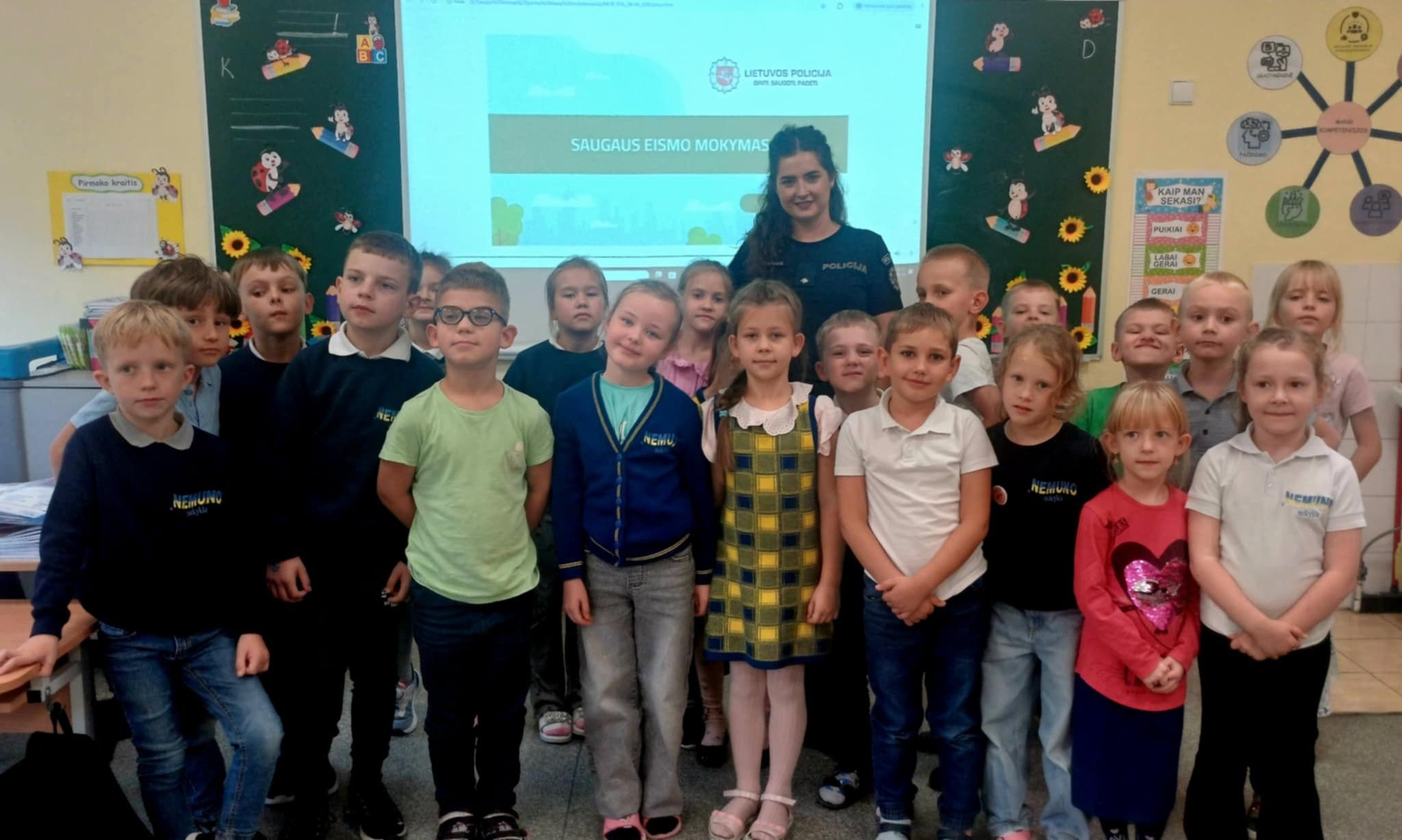 Pirmokai šiandien dalyvavo saugaus eismo pamokoje, kurią vedė policijos pareigūnė. Mokiniams žaisminga forma buvo išdėstyti saugaus elgesio principai, atskleisti gatvėje ir keliuose tykantys pavojai bei išsiaiškinta, kaip jų išvengti.