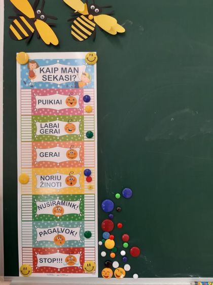 O kaip mokytojai suprasti, jei vaikas neišsiduoda apie savo jausmus? Klasėje turime plakatą, kur vaikai savo emocijas pažymi spalvotu magnetuku. Tai žino tik pats mokinys. Mokytoja stebėdama užpildytą plakatą atkreipia dėmesį į vaikų emocinę būseną.