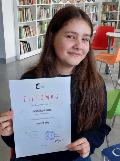 6 klasės mokinė Gabija Jokubauskaitė, aplenkusi 29 mokinius iš skirtingų Kauno mokyklų, užėmė 2-ą vietą!  O 8 klasės mokinė Danielė Latoškinaitė aplenkė net 21 mokinį iš skirtingų Kauno mokyklų ir užėmė 9-ą vietą!