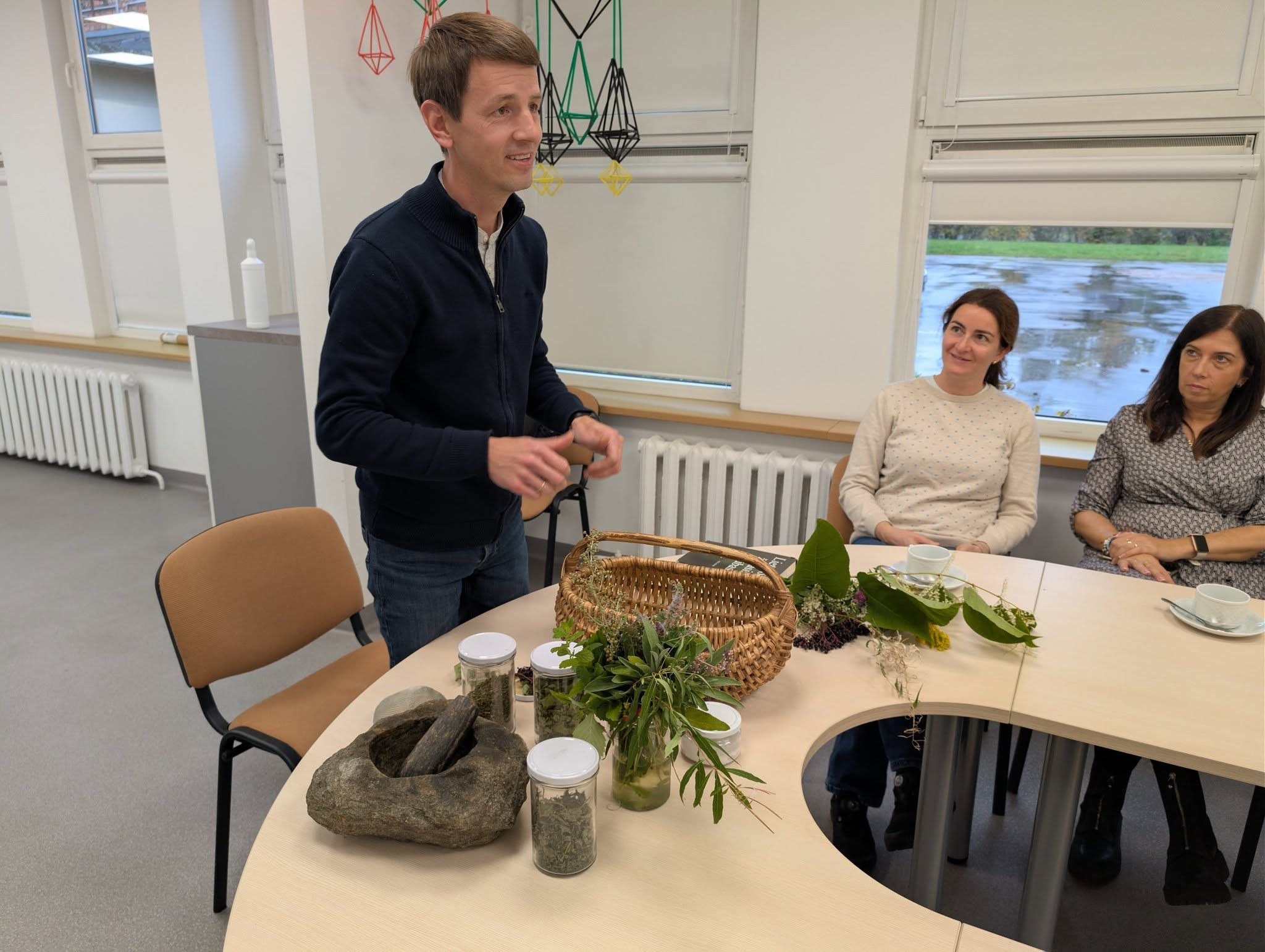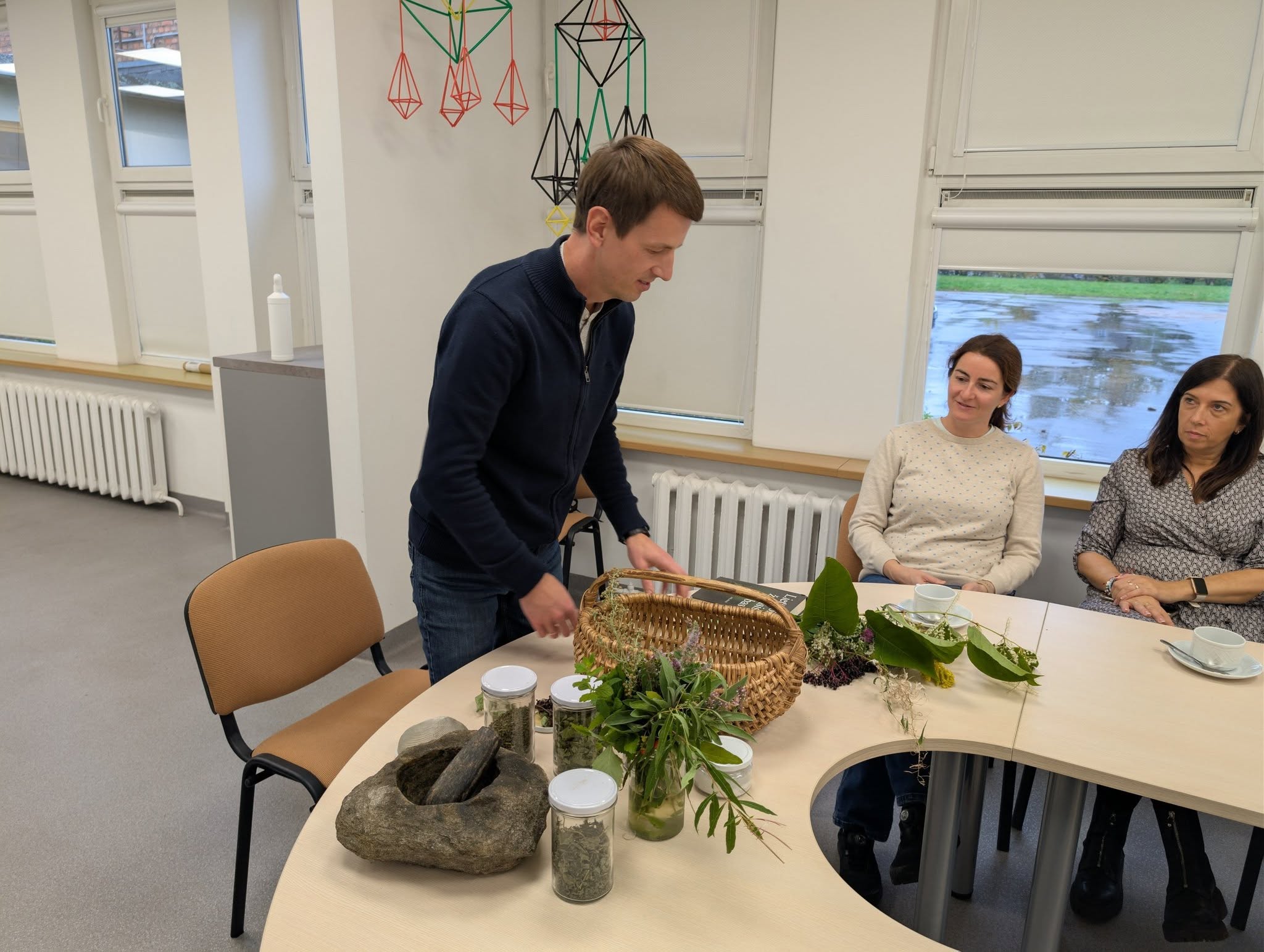 Kol projekto mokiniai ruošė pristatymui savo darbus, mokytojai iš Turkijos, Lenkijos ir „Nemuno“ mokyklos dalyvavo edukaciniame susitikime su žolininku, vaistininku ir lektoriumi dr. Mariumi Lasinsku.