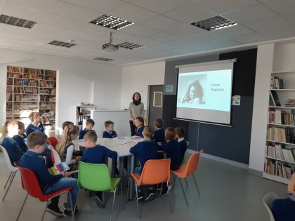 Rugsėjo 26 d. bibliotekoje vykusi trečiokų lietuvių kalbos pamoka buvo skirta rašytojai Janinai Degutytei.