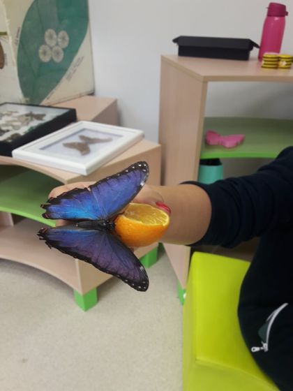 Sakome AČIŪ ikimokyklinio ugdymo pedagogei Vilmai už suorganizuotą edukacinę pamoką apie egzotinius drugelius. "Linksmųjų pėdučių" studijos vaikai labai laimingi