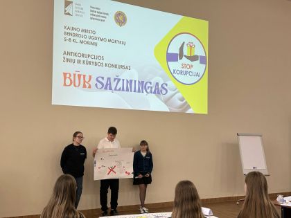 Balandžio 17 d. 5 klasės mokinių komanda dalyvavo Kauno miesto bendrojo ugdymo mokyklų 5-8 klasių mokinių antikorupcijos żinių ir kūrybos konkurse “Būk sążiningas”, kuris vyko Kauno miesto švietimo inovavijų centre.