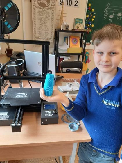 Tačiau 1-oko Kęstučio ir jų tėvelių dėka visi pradinukai šiandien buvo nustebinti. Pamatėme kaip 3D spausdintuvas praktiškai atlieka veiksmus. Susidomėję 4 valandas stebėjome procesą, kaip iš ekologiško plastikinio siūlo "užaugo" puiki vazelė.