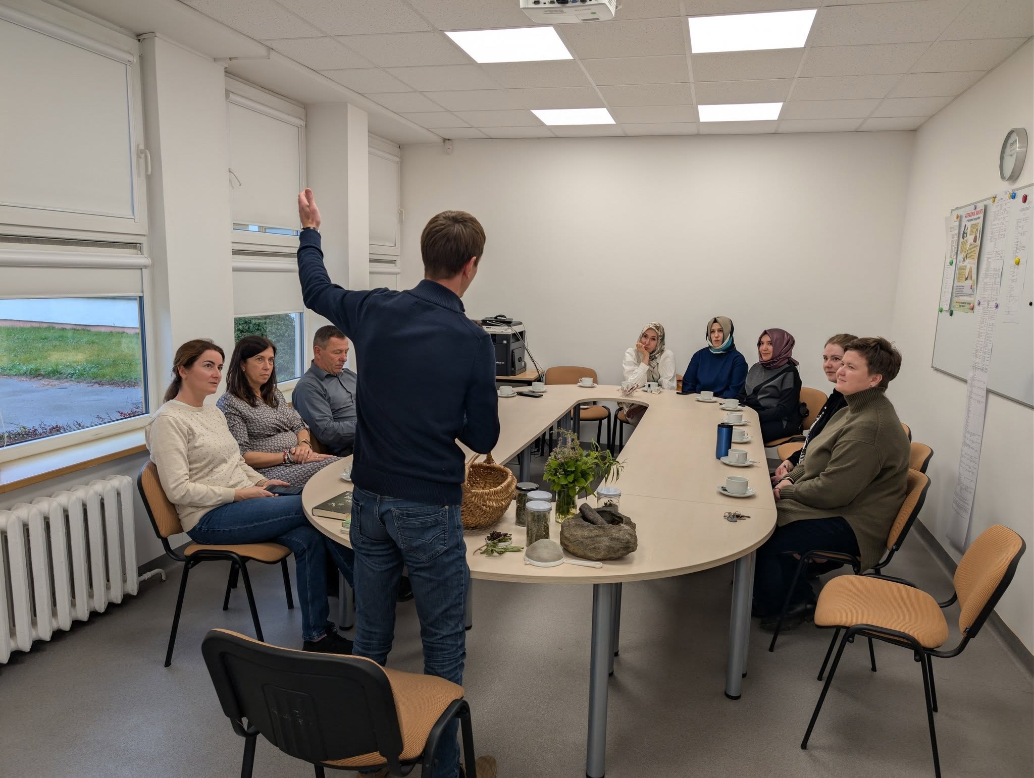 Kol projekto mokiniai ruošė pristatymui savo darbus, mokytojai iš Turkijos, Lenkijos ir „Nemuno“ mokyklos dalyvavo edukaciniame susitikime su žolininku, vaistininku ir lektoriumi dr. Mariumi Lasinsku.