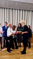 Svečius pasitiko mokyklos mokiniai su dainomis ir pasirodymais.